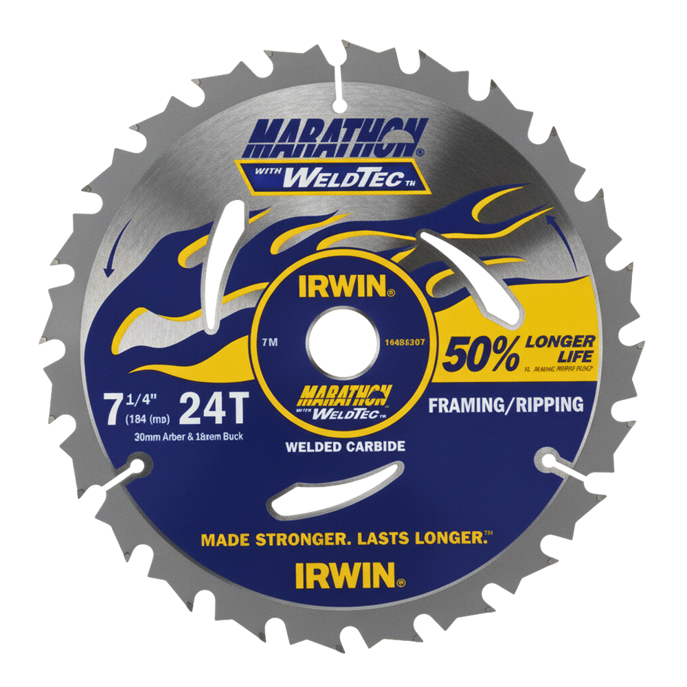 The new IRWIN® WeldTec™ circular saw blades are precision engineered to deliver long life and durability without sacrificing speed of cut. Made in Italy, these blades feature exclusive welded carbide teeth for industry-leading strength. The heat resistant non-stick coating reduces binding and gumming so the blades run cooler and deliver cleaner, truer cuts. Plus, the blades are laser cut with expansion control slots to reduce warping and vibration. The new blades are available for Construction, Demolition and Specialty applications.