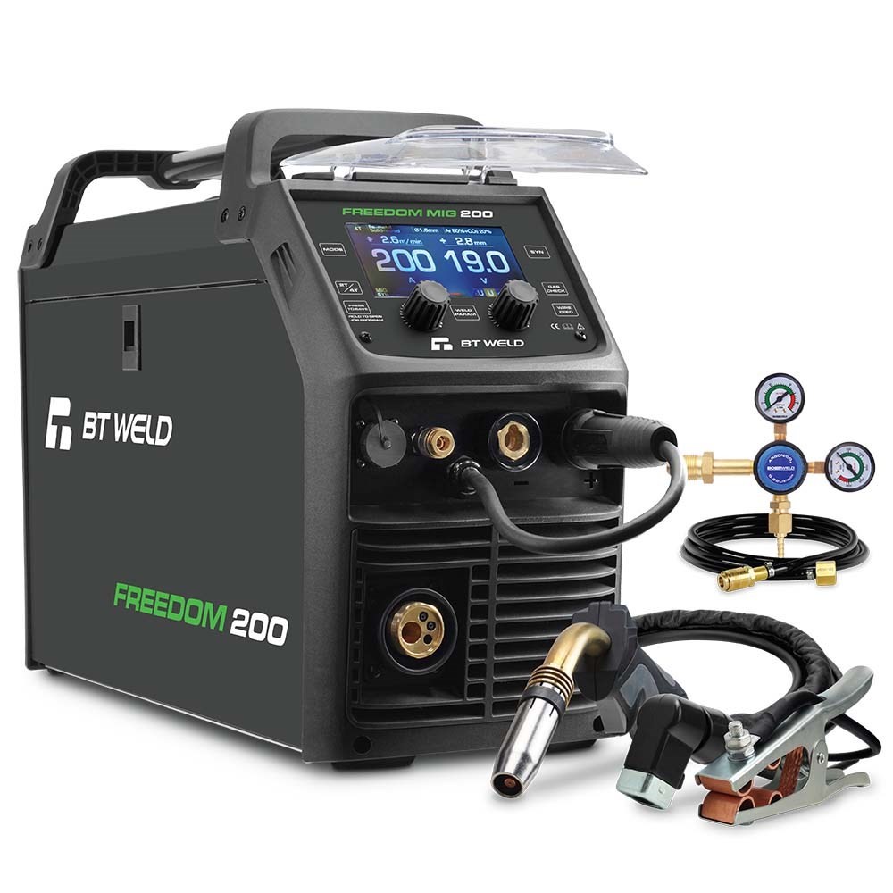 The BT Weld FREEDOM 200 PFC is a high-performance 240V inverter welder, designed for MIG, Stick (MMA), and Lift-TIG welding.